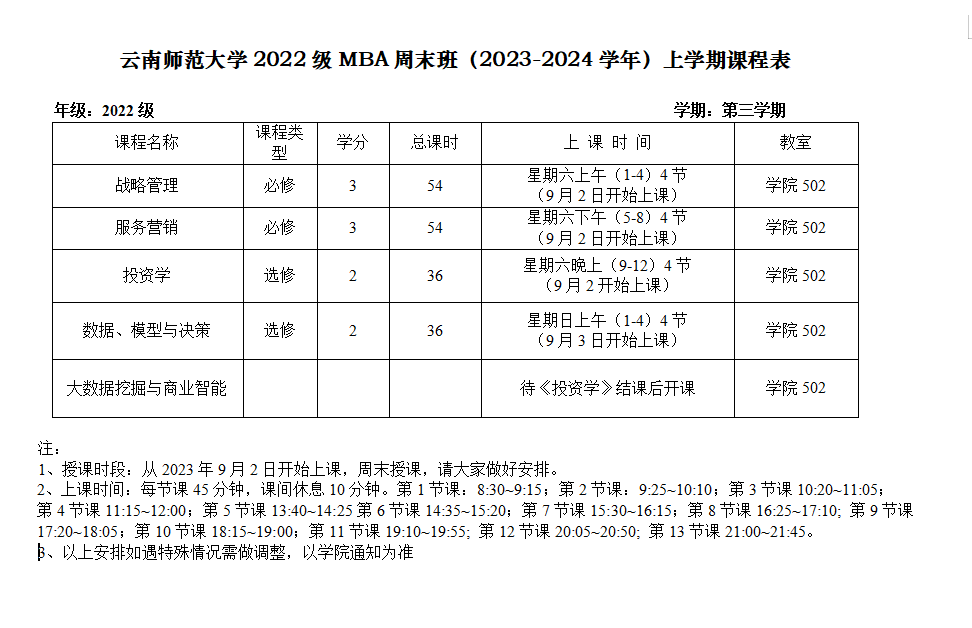 2022级MBA周末班第三学期课程表