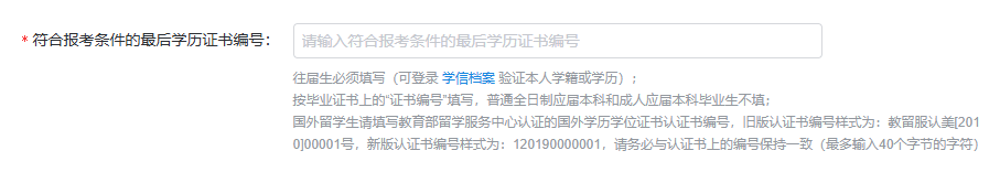 7. 毕业证书编号请填写16位或18位电子注册号或者公司编号,若毕业证书上没有16或18位数字编号,则填写证书上其他数字编号;若有学位证书,请将学位证书编号也填写准确。毕业证书编号若只显示一个编号,则填写该编号;若显示两个编号,则填写“公司编号”项。