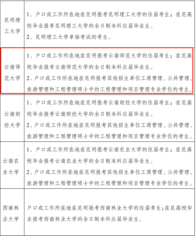 (2) 户口或工作所在地在昆明报考其他招生单位工商管理、公共管理、旅游管理和工程管理硕士中的工程管理和项目管理专业学位的考生。