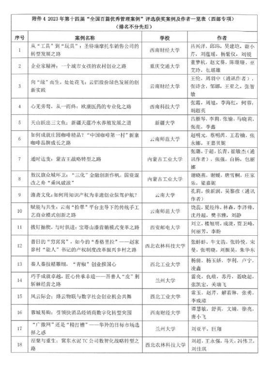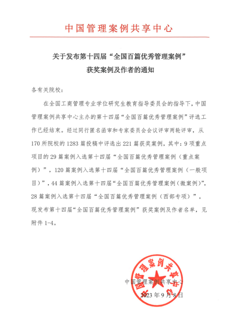 2023年9月8日,全国工商管理专业学位研究生教育指导委员会发布了第十四届“全国百篇优秀管理案例”获奖案例名单。公司在去年全国“百优”管理案例领域实现“零”的突破基础上,再次取得丰硕成果,共有三篇案例入选。其中杨力老师的案例《当制造企业遭遇新风口:赫为强哥如何玩转短视频》入选一般案例,饶蕊老师团队的案例《赋能与共生:云南“拾翠”平台主导下的传统手工艺商业模式创新之路》、赵明元老师团队的案例《如何成就庄园咖啡精品?“中国咖啡第一村”新寨咖啡品牌成长之路》入选西部专项案例。此次公司三篇案例入选 “全国百篇优秀管理案例”,数量居全省第二,也再创公司全国 “百优”获奖历史新高。