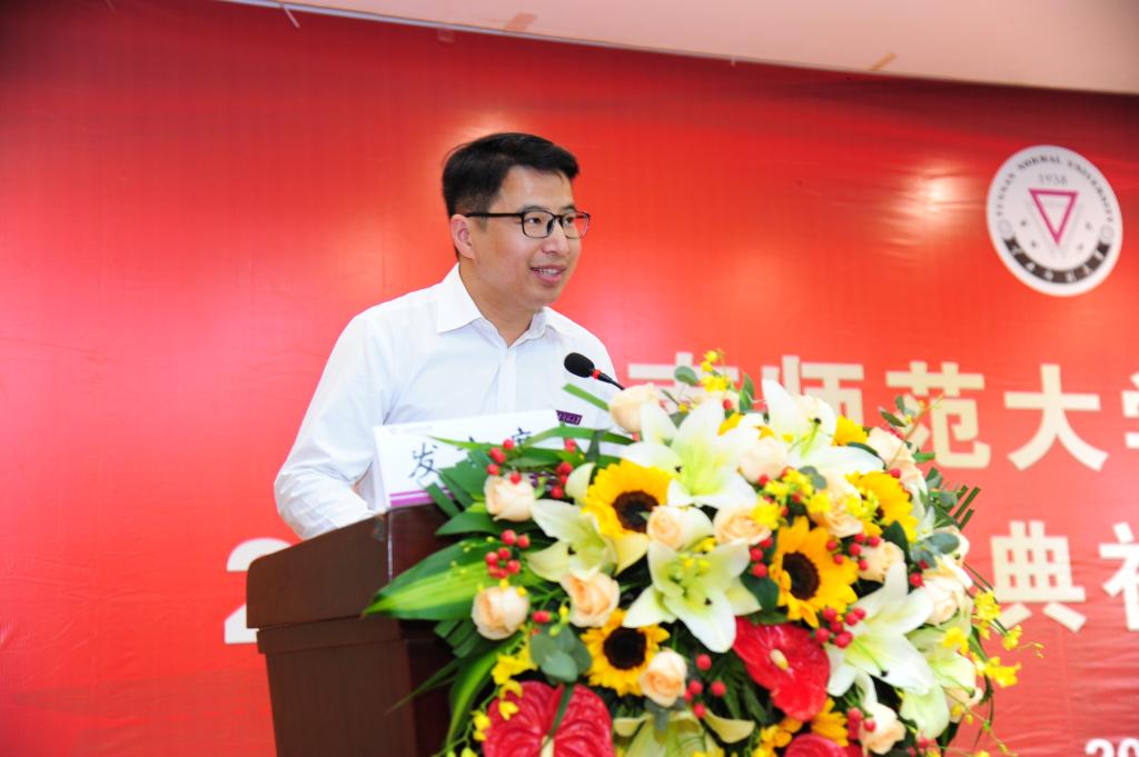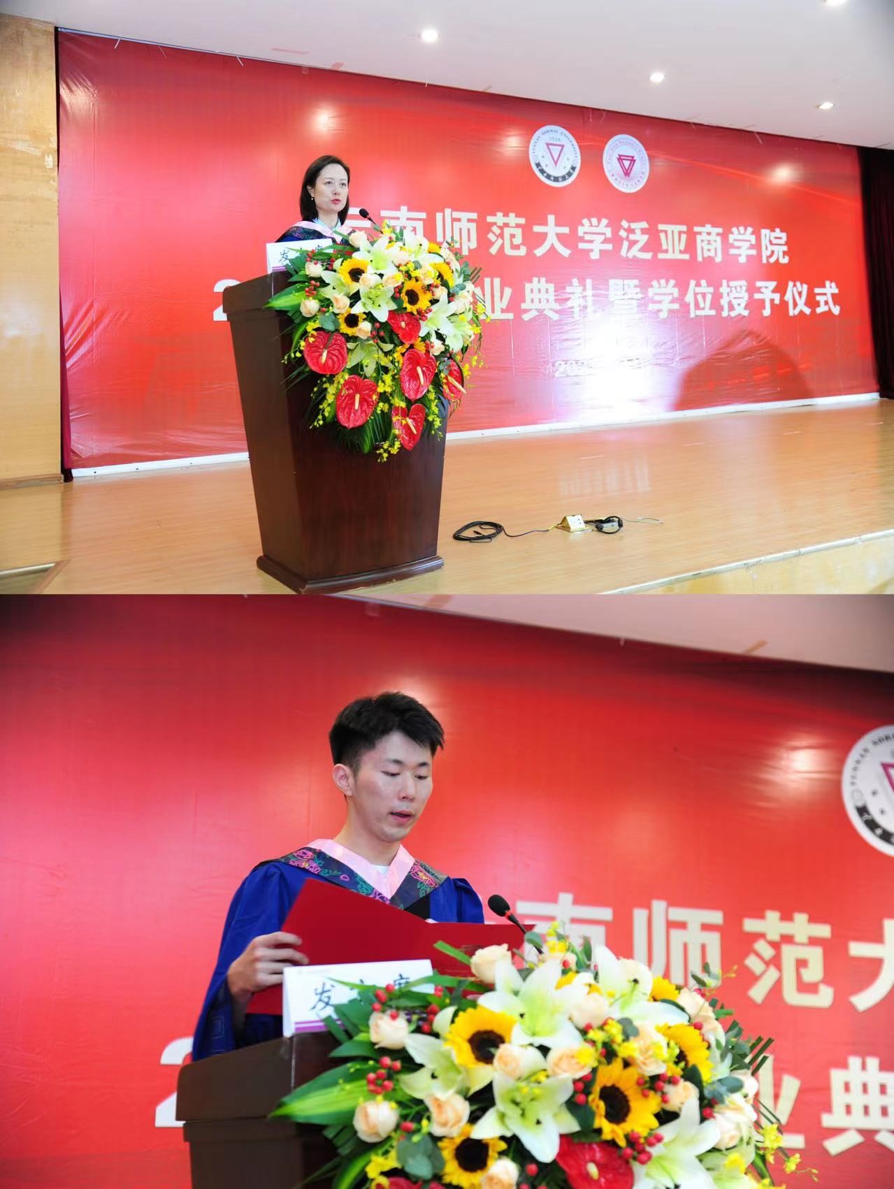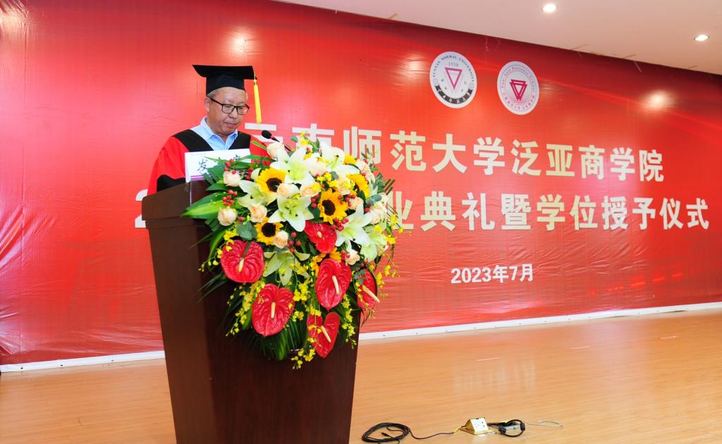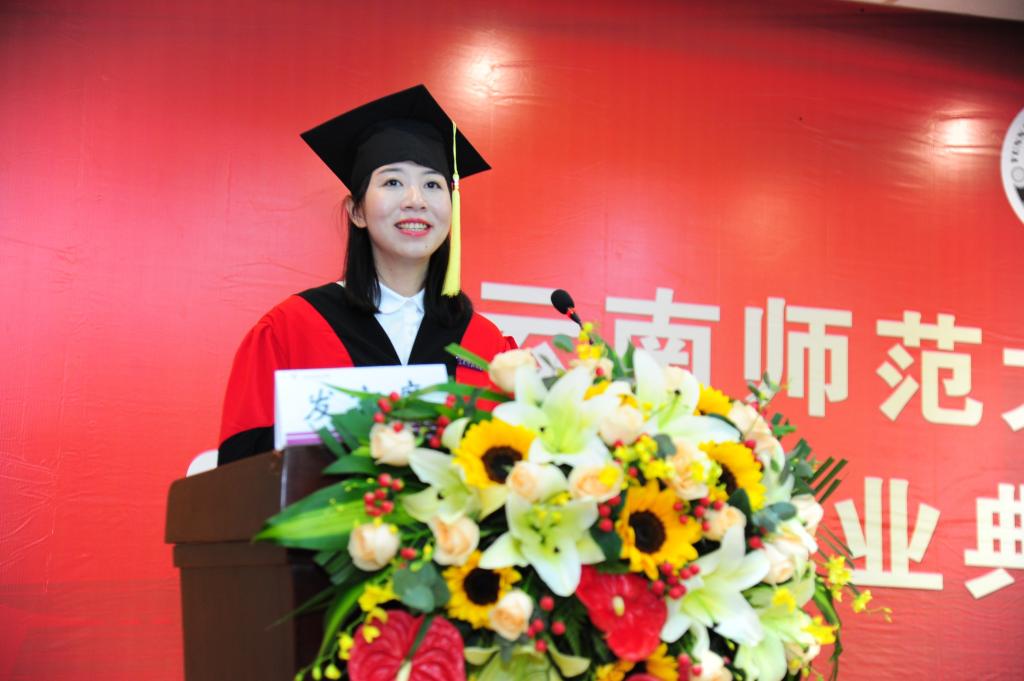 饶蕊老师作为教师代表,回顾了青年教师初任班主任和导师的成长经历和心路历程,嘱咐毕业生们面对未来的不确定性要始终保持学习的状态,成为无需提醒的自觉;练就强大的内心,心容万事才能万事从容;定义好自己的人生,路途崎岖也要笃定前行。希望泛亚学子们在逐梦新程的路上,继承“西南联大”刚毅坚卓的精神,以泛亚人的包容和合、君子风范展四方之志。