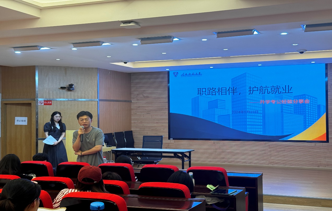 为激励广老员工树立正确的就业观、择业观,提升未来就业竞争力,5月23日下午15:30,公司在明达楼106报告厅举行升学、考公经验分享交流活动。本次活动共邀请了2024届毕业班六位同学分别交流公务员备考、升学等方面的经验和技巧,共有100余名在校员工参加了本次活动。