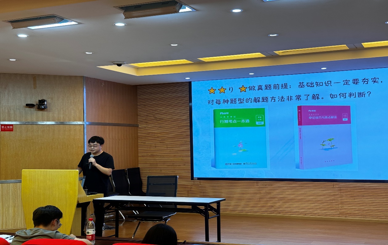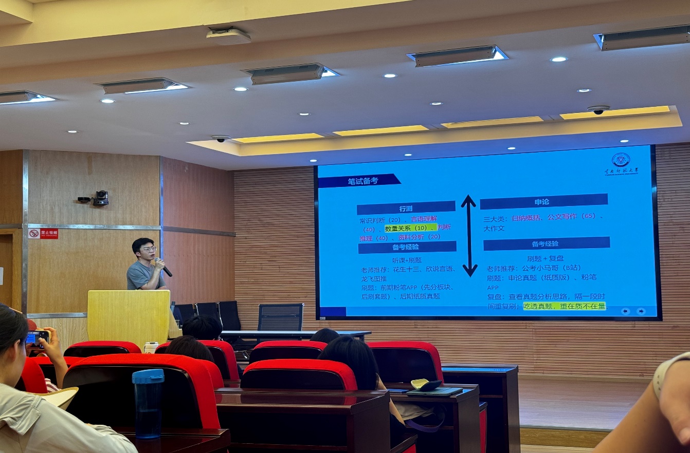龚成琳同学从国考、省考、选调三个方面为同学们进行了分享,详细介绍了笔试技巧,并重点交流了结构化面试和无领导小组面试的技巧。陶肖肖同学分别从求职过程的岗位选择、笔试备考、面试准备、心态调整四个阶段给大家进行了分享。杨曦桐同学结合自身情况分享其公务员备考经验,强调了提前计划和面试礼仪的重要性。吴鑫同学不仅分享了备考公务员中真题复盘的重要性,也介绍了春招、秋招的求职攻略。张宇飞同学从博士研究生申请的流程和注意事项上做了详细讲解,他强调要注重提高自身素质,合理安排笔试及面试备考时间。曹欣同学表示考博不能盲目,一定要结合自身的具体情况进行合理选择。