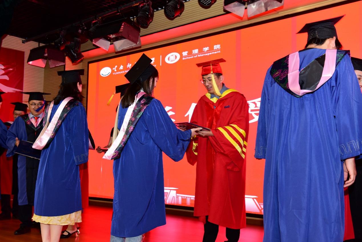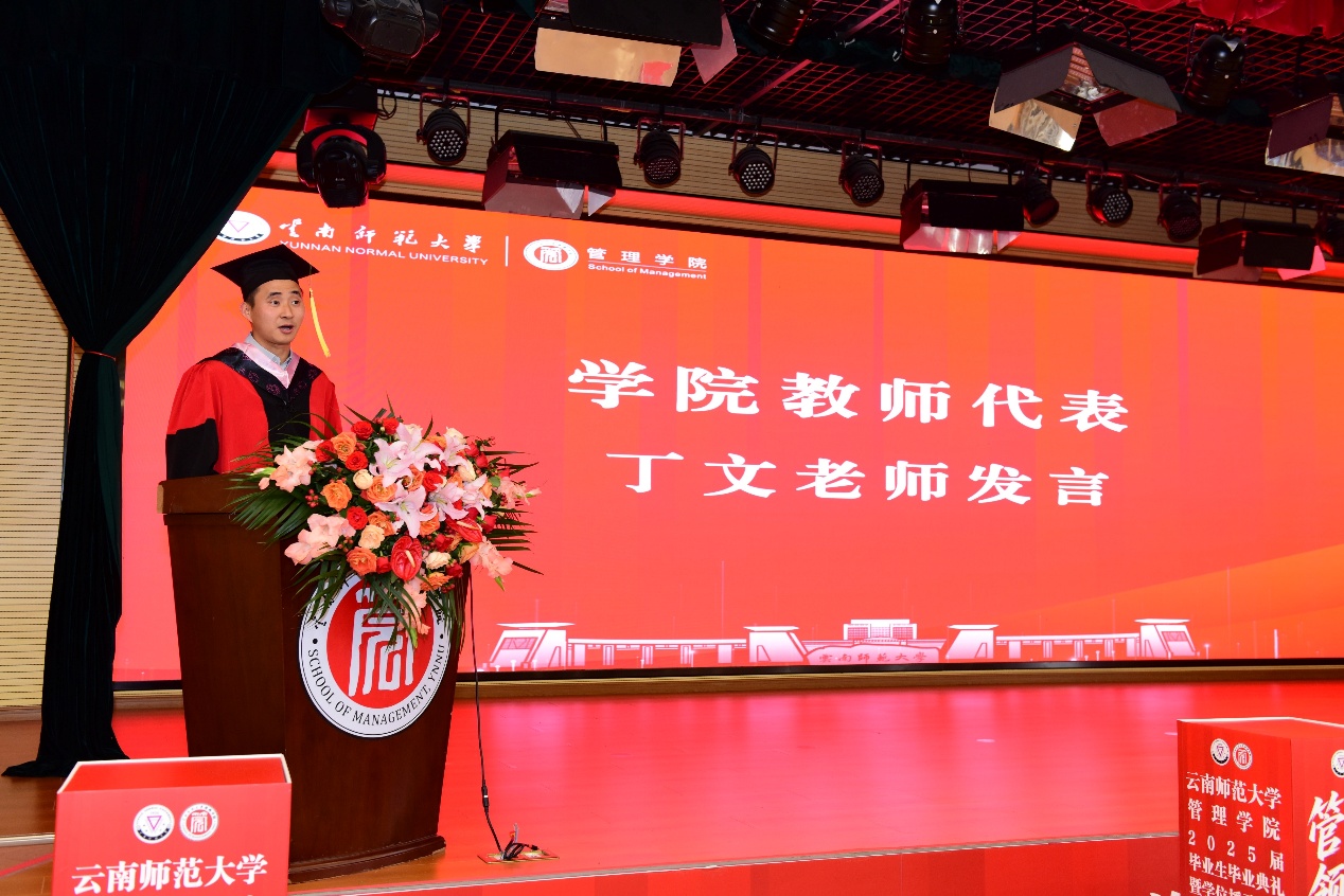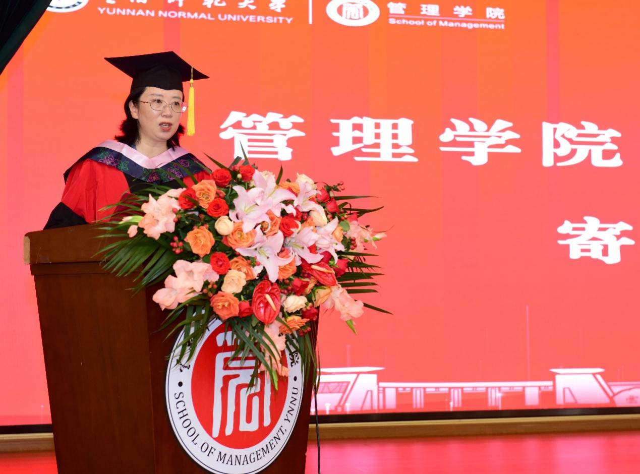 李艳经理以“竹、烛、樱”为意象,赠予毕业生三声叮咛:“以竹为范,守心正立身直”,要求以诚信为节、责任为枝,让管理决策经得起良知叩问;“秉烛成星,聚微光映长夜”,呼吁在平凡岗位中汇聚人性温度,以共情力与协作精神点亮时代;“樱寄相思,携家国赴山海”,叮嘱毕业生常回望母校、倾听基层、创新开拓,永葆“眼中不灭的光,心中不冷的血”。
