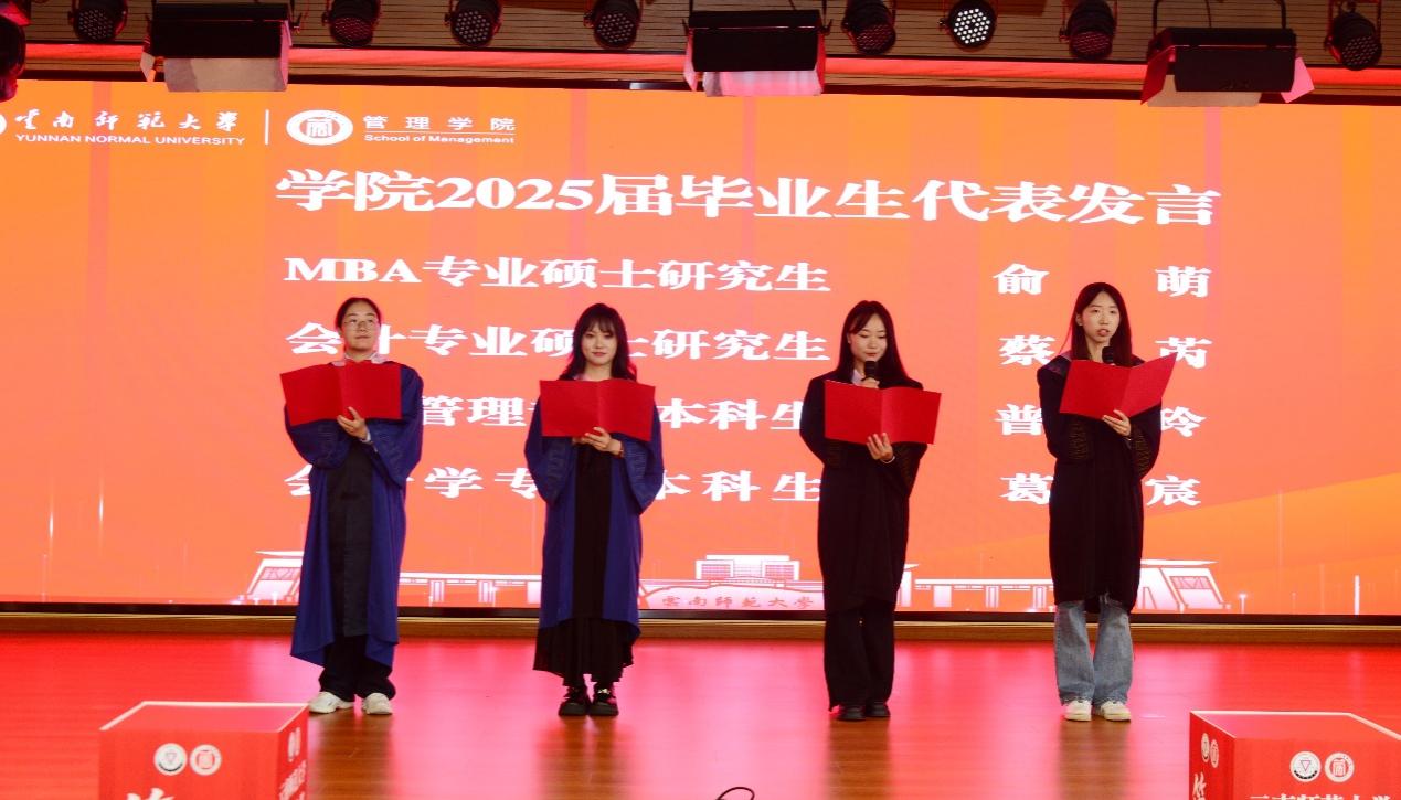 教师代表丁文老师寄语毕业生“面对挫折不屈,追求真理不懈”,感谢教师团队的辛勤付出。毕业生代表俞萌、普四玲蔡明芮、葛婧宸分享了在校时光的成长感悟,表达对母校的感恩与不舍。孔迎春副书记以“思想的罗盘、创新的火种、开阔的胸怀”为喻,勉励毕业生在信息洪流中保持独立判断,打破桎梏,成就自我的同时助力他人。