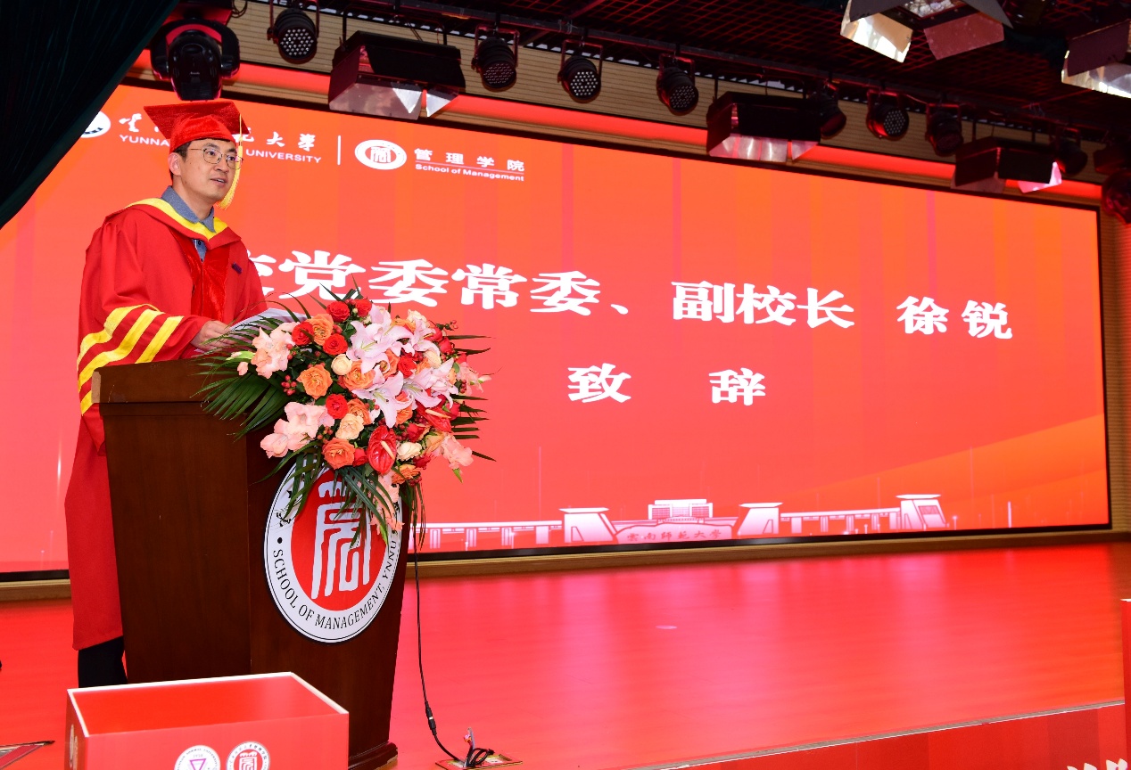 徐锐副董事长以“终身学习、传承联大精神、担当时代责任”为主题,向毕业生送上殷切嘱托。他强调,在数字化时代,传统管理模式面临变革,毕业生需以“执着不懈的汗水”提升职业素养,运用大数据、人工智能等技术适应市场需求。同时,要传承西南联大“刚毅坚卓”的精神,将“小我”融入“大我”,在乡村振兴等国家战略中践行使命,争当“与民族同呼吸、与时代共命运”的追梦人。