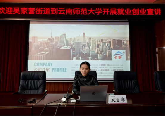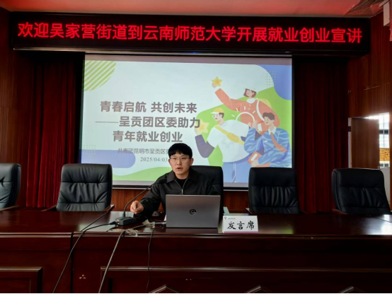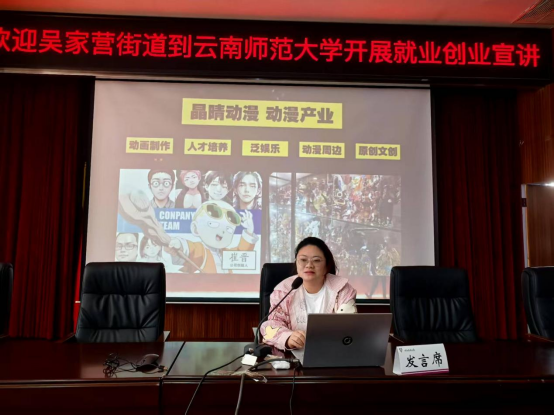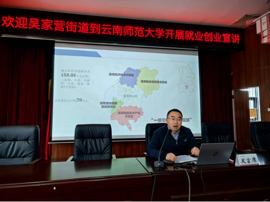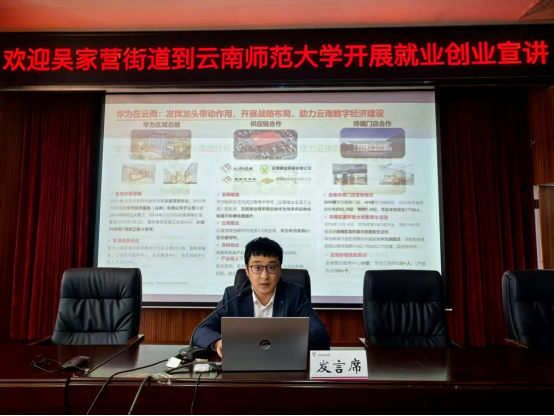 为深化校地合作,助力青年学子把握就业创业机遇,2025年4月3日下午,美加墨世界杯官方网站联合吴家营街道在呈贡校区明德一号楼101报告厅举办就业创业宣讲活动。活动汇聚呈贡区委组织部、区人社局、团区委、云南省数字经济开发区相关负责人,华为、晶晴动漫、云南简诺电子商务、七彩社会服务等企业代表,以及来自美加墨世界杯官方网站、经济公司、传媒公司等200余名师生共同参与。