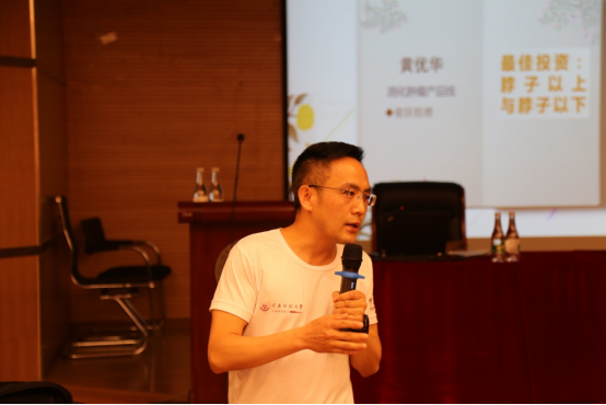 第四位是2019级集中班的黄优华同学,从事医药行业,他用“最佳投资:脖子以上与脖子以下”为主题,分享了他自己的故事。他用自己被人调侃“人没到肚子先到”的经历,告诉了大家体育锻炼的重要性,也推荐了一些用以解决焦虑情绪的读本。