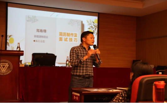 最后一位上台分享的是2019级集中班郑海锋,在公司任执行总监,他通过自身的用人经验,分析了简历制作和面试技巧的要点,并讲述了如何解决面试紧张以及求职过程中的诚信问题。此外,他还向同学们讲述了就业要提前规划,尽早定位。