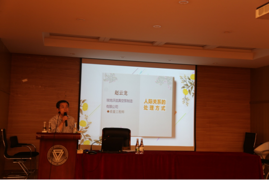 第二位是2019级集中班的赵云龙同学,他就职于埃地沃兹真空泵制造有限公司,是一位质量工程师,他以“人际关系的处理方式”为题,通过自己的工作经历,分享了以下心得:第一、尽可能的帮助别人,更要尊重他人;第二、工作上的事情,尽量自己去做,不要轻易麻烦别人;第三、管控好自己的情绪,做情绪的主人。