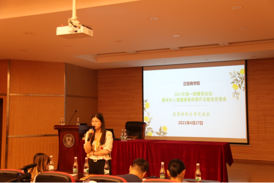 2021年4月27日,公司在明达楼106报告厅举行2021年第一期菁英论坛暨员工心理健康素质提升及就业交流会。此次交流会邀请到公司2019级非全日制MBA集中班八位同学作为分享嘉宾。讲座旨在通过公司非全日制员工与全日制员工的交流,结合朋辈榜样的自身经历,以零距离互动交流形式,帮助在校员工处理好环境适应、人际交往、求职就业等方面压力,同时丰富校园文化,营造有利于员工心理健康的校园氛围 。